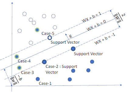 两个类别的训练数据中距离决策边界最近的数据称为支持向量 (support vector),它们分别位于两条平行于决策边界的线,满足:$w^Tx_i + b = 1$ 或 $w^Tx_i + b = -1$,由此可以推导两个类别之间的间隔: