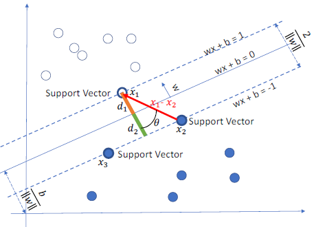 & \quad\ d_1 + d_2 = {||x_1 - x_2||}_2cos\theta = \frac {2}{ {||w||}_2}