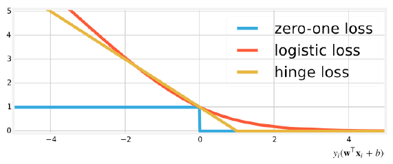 - 在自变量大于1的部分值为0,即:只要对某个数据分类正确,则不再针对该数据进行优化