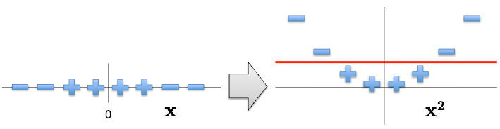 例如:定义 $\phi(x) = x^2$ ,则将 $x_i$,$x_j$ 映射到 $\phi(x)$ 所在的空间后,目标函数 $\min_\alpha \ \frac {1}{2} \sum_{i=1}^m\sum_{j=1}^m\alpha_i\alpha_jy_iy_j(x_i \cdot x_j) - \sum_{i=1}^m\alpha_i$ 变为: