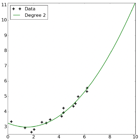 令 $\phi(x) = [1,x,x^2]$ ,对 $\phi(x)$ 进行线性拟合,即 $y = w_0 + w_1x + w_2 x^2 = \phi(x) \cdot [w_0,w_1,w_2]$ ,如图所示