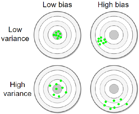 左上图训练数据的分布比较集中,且与圆心的预测值较好地吻合,此时方差和偏差都比较小;右上图数据的分布比较集中,但与预测值相互偏离,此时方差较小,但偏差较大;左下图训练数据分布在预测值附近,但其分布较为分散,此时偏差较小,但方差较大;右下图数据分布较为分散,且偏离预测值,此时方差和偏差都比较大