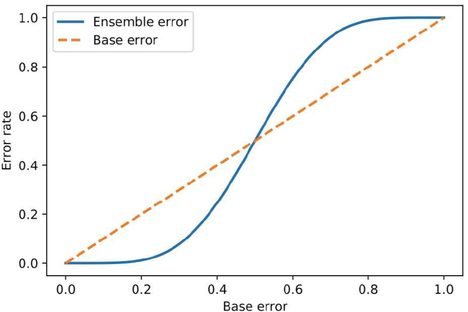 $$\epsilon_{ens} = \sum_k^n\begin{pmatrix}n \\ k \end{pmatrix}\epsilon^k(1 - \epsilon)^{(n -k)} \quad k > \lceil\frac{n}{2}\rceil$$ - 当独立模型的错误率低于0.5时,集成学习的错误率总是低于单个独立模型