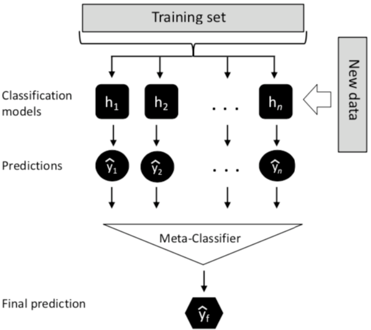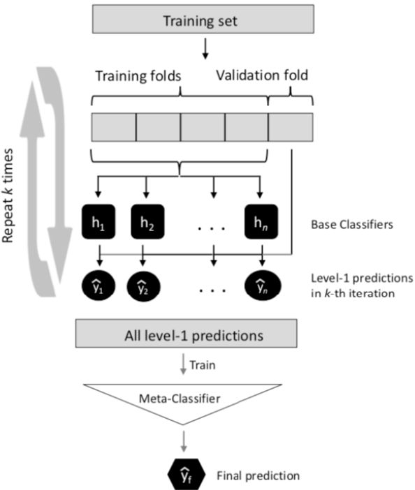 - 先使用初始训练数据训练出一系列初级模型,然后以初级模型的输出作为输入特征,初始训练数据的输出作为标签,训练次级模型