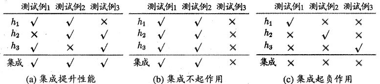 图a的三个模型具备准确性及多样性,集成学习性能提升;图b三个模型具备准确性,缺乏多样性,集成学习不起作用;图c三个模型具备多样性,但准确性差,集成学习性能下降