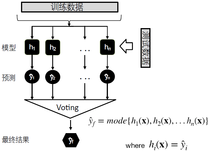 - 假设有n个独立的分类模型,每个模型输出一个预测值,取n个预测值的众数作为最终的预测结果: