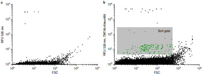 为检测TM7是否被IgG标记,收集10-100个荧光标记的细胞,进行