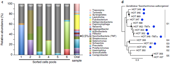 共测序,组装,分析了23个SAGs,代表人类口腔微生物TM7类群中的6个类群:类群1,2,3,5