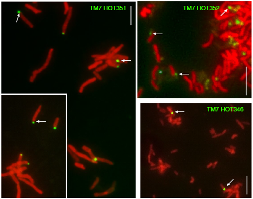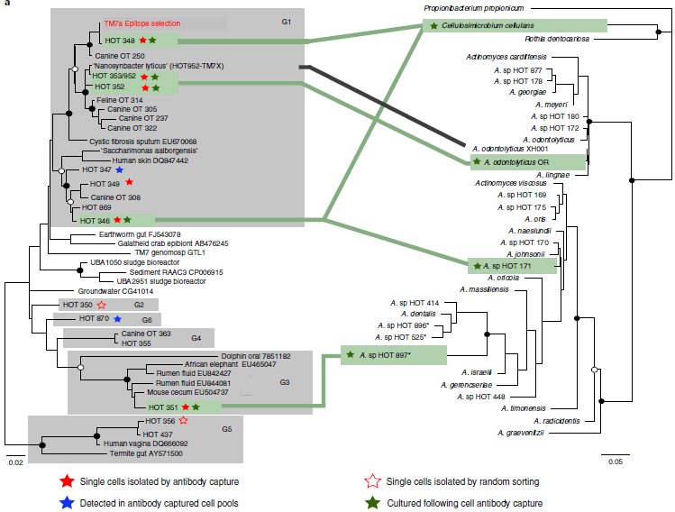 通过对抗体标记的样品进行细胞分选及多重置换基因组扩增,从384组分选获得的细胞中得到二十多个TM7 SAGs (single-cell amplified genomes),根据16S rRNA序列分为6个物种:HOT346, HOT348, HOT349, HOT351, HOT352, HOT353/952