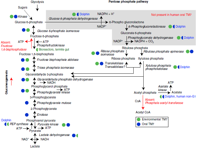 开放环境中的TM7物种编码近乎完整的磷酸戊糖途径,偶联异型乳酸发酵,从而通过底物水平磷酸化产生NADPH和ATP。人类口腔TM7缺少磷酸戊糖途径中起始NADPH产生的关键酶及异型乳酸发酵的关键酶:磷酸木酮糖磷酸转酮酶。因此,口腔TM7可能利用己糖-戊糖的相互转化并主要通过糖酵解产生ATP