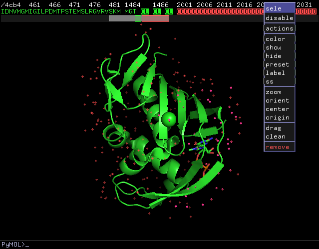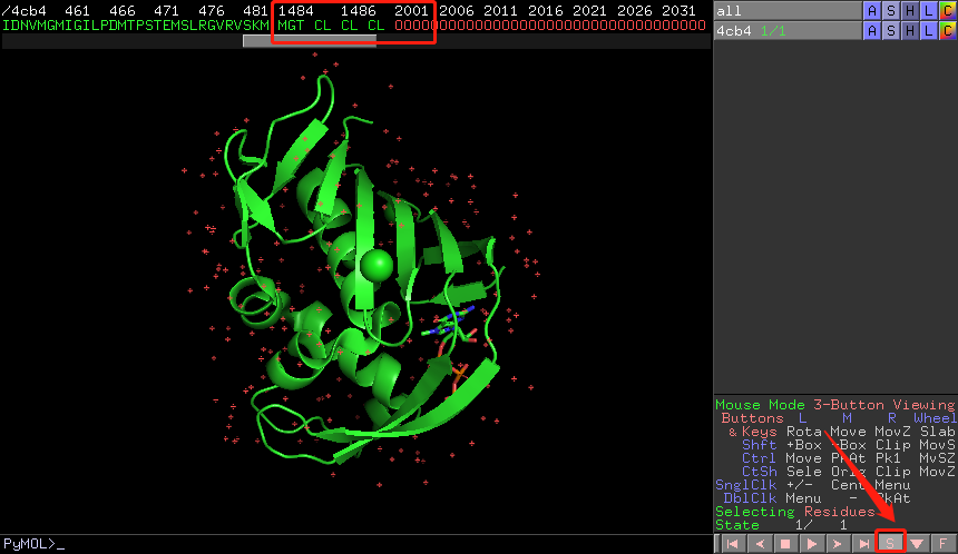 点击右下角S显示序列,MGT为共结晶的配体,CL为氯原子,O为水鼠标拖选序列中的氯原子和水,右键