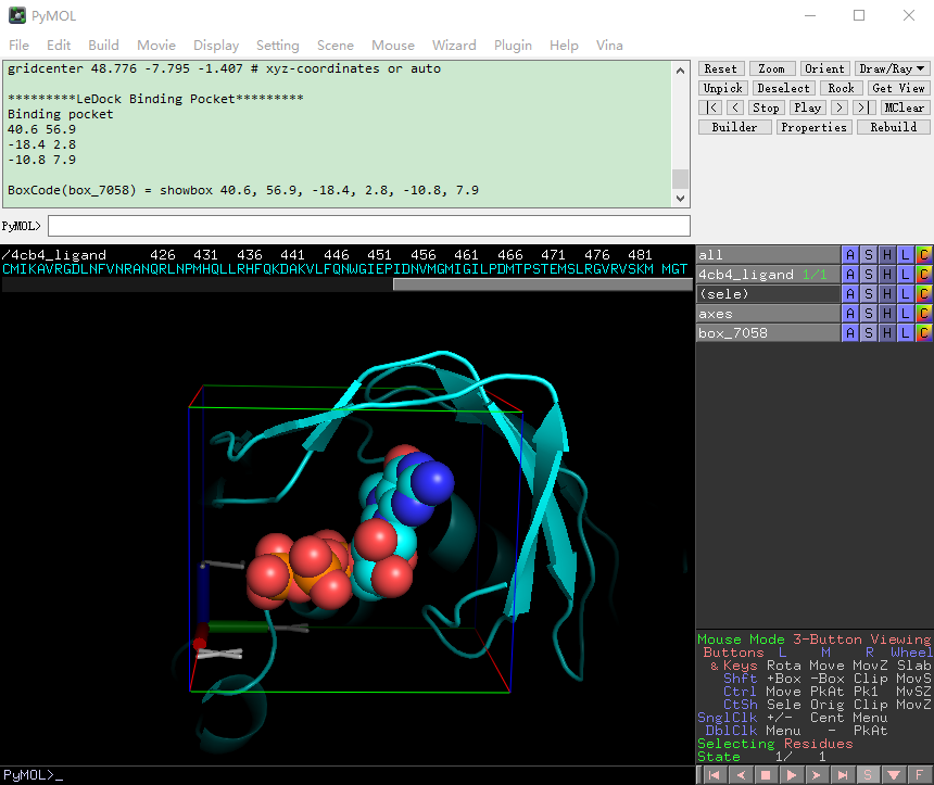 4cb4_ligand.pdb,鼠标点击序列中的MGT选中它,菜单栏Plugin -> Legacy Plugins -> GetBox Plugin -> Get box from selection (sele)