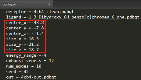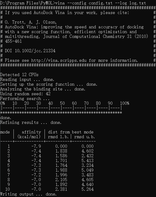 receptor,ligand及配置文件的目录,运行vina --config config.txt --log log.txt