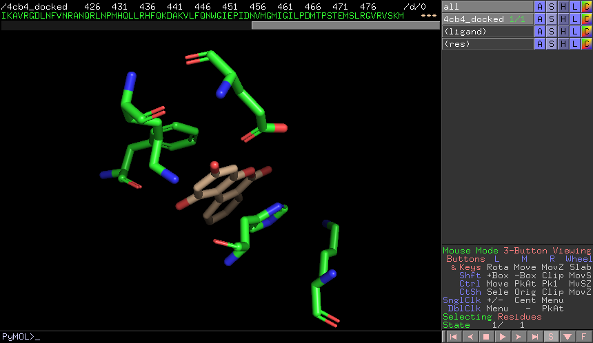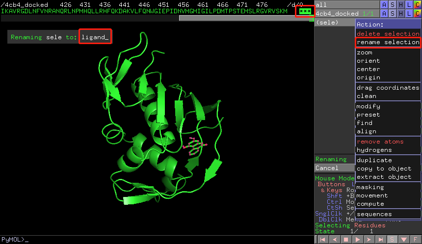 File -> Reinitialize -> Everything清空所有对象,重新打开4cb4_clean.pdb将配体重命名,选中序列中的