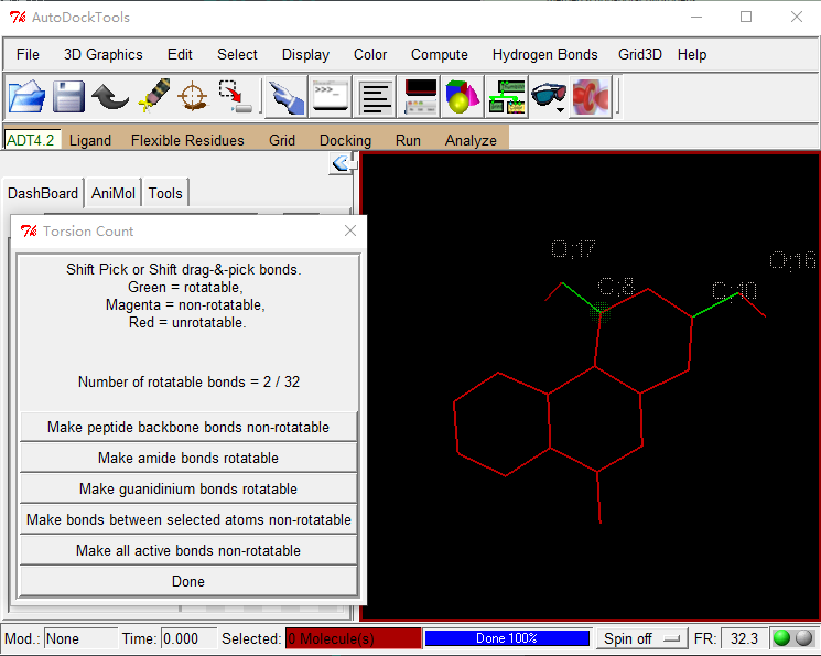 Ligand -> Torsion Tree -> Choose Torsions -> Done