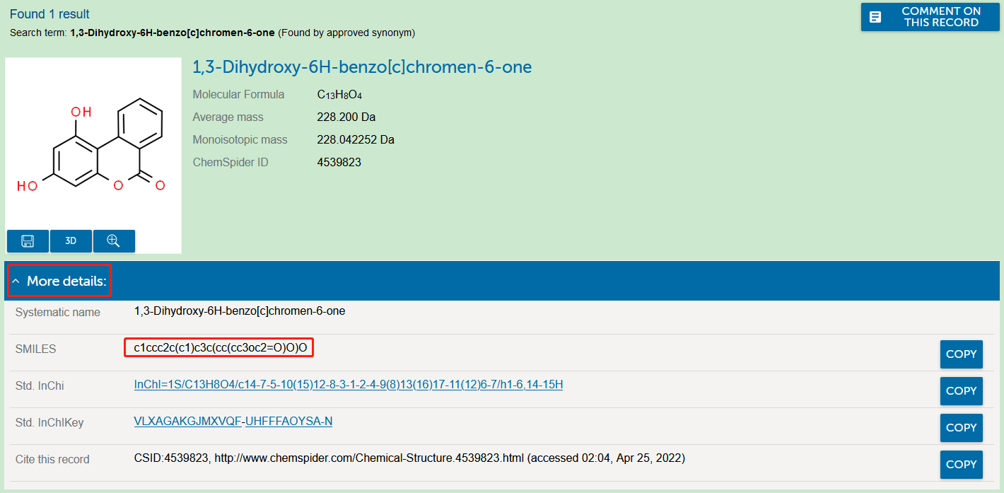 1,3-Dihydroxy-6H-benzo[c]chromen-6-one搜索,搜索结果页点击More details展开,复制SMILES