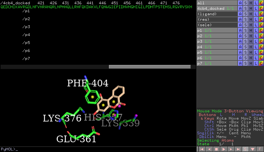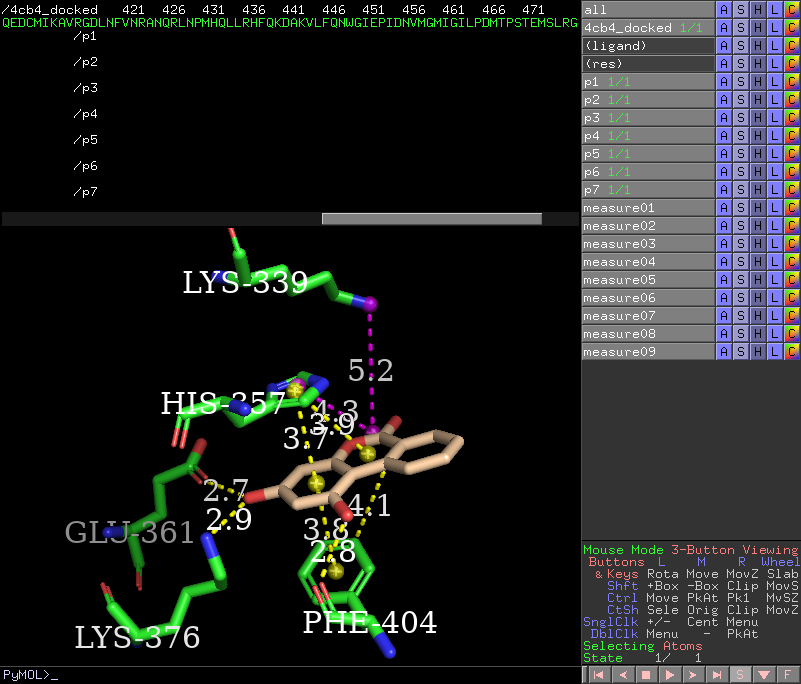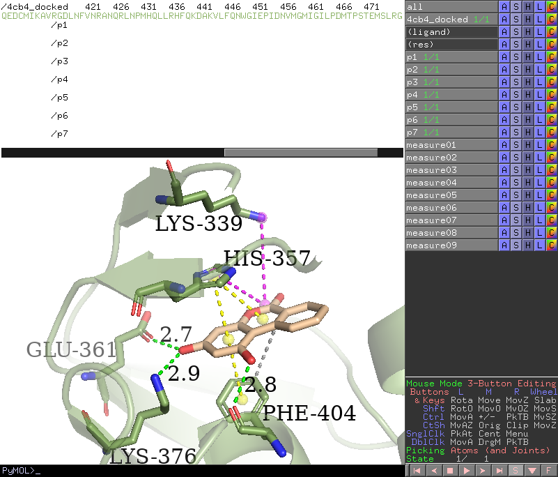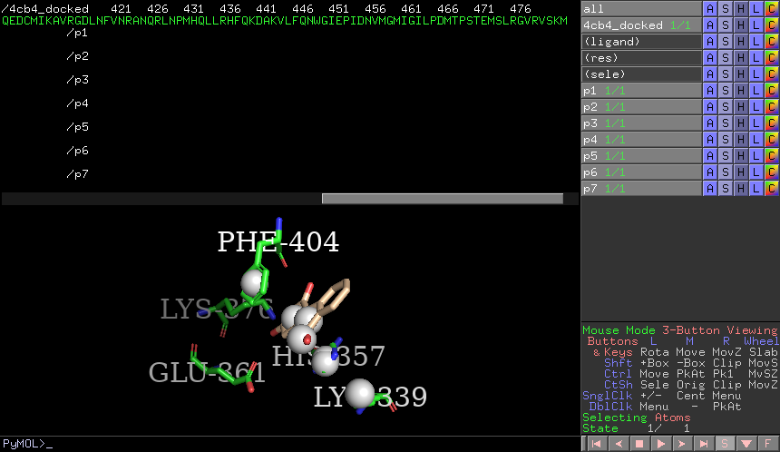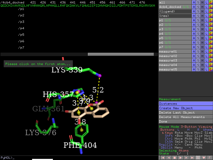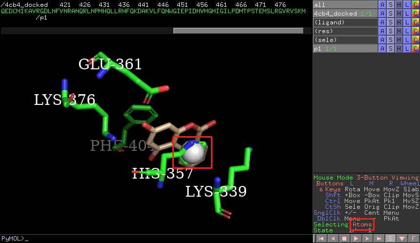 PHE-404苯环上任意对位的2个碳原子或全部6个碳原子,命令行输入com sele, object=p4点击选中配体酯基的2个氧原子,命令行输入