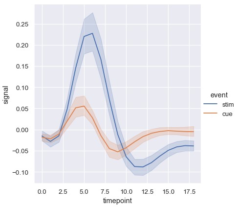 1 | sns.relplot(x='timepoint', y='signal', hue='event', kind='line', data=fmri) |