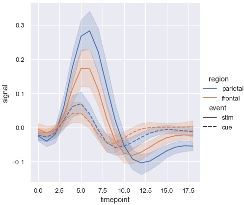 1 | sns.relplot(x='timepoint', y='signal', hue='region', style='event', kind='line', data=fmri) |