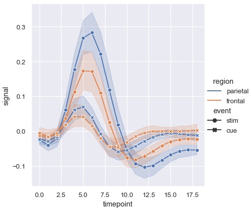1 | sns.relplot(x='timepoint', y='signal', hue='region', style='event', dashes=False, markers=True, kind='line', data=fmri) |