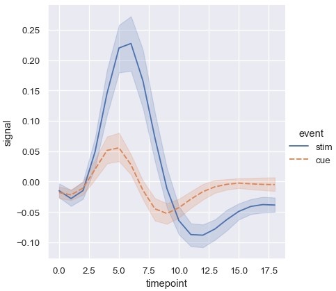 1 | sns.relplot(x='timepoint', y='signal', hue='event', style='event', kind='line', data=fmri) |