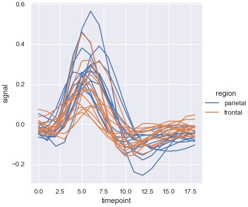 1 | sns.relplot(x='timepoint', y='signal', hue='region', units='subject', estimator=None, kind='line', data=fmri.query("event == 'stim'")) |
