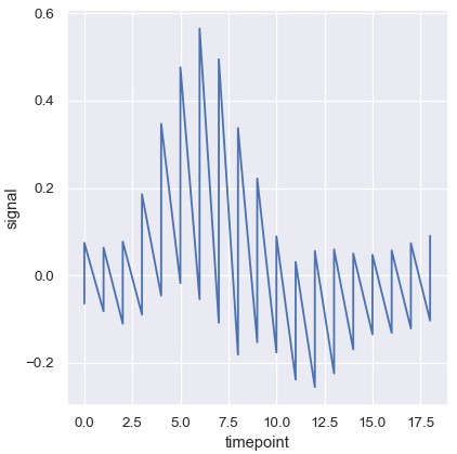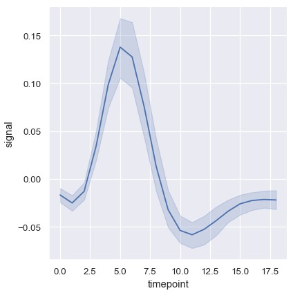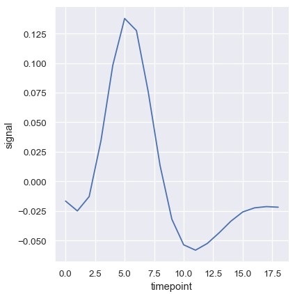 1 | sns.relplot(x='timepoint', y='signal', ci=None, kind='line', data=fmri) |