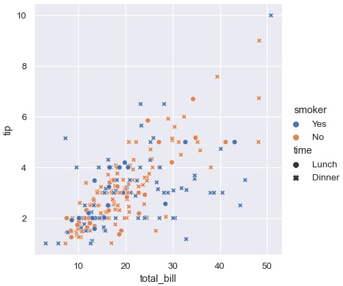 1 | sns.relplot(x='total_bill', y='tip', hue='smoker', style='time', data=tips) |