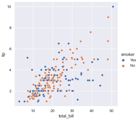1 | sns.relplot(x='total_bill', y='tip', hue='smoker', data=tips) |
