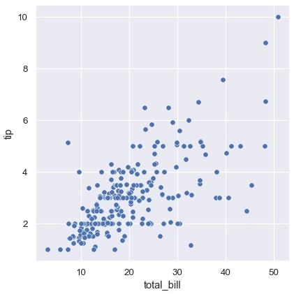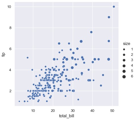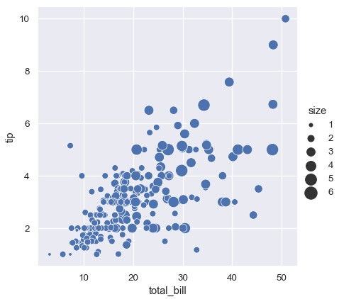 1 | sns.relplot(x='total_bill', y='tip', size='size', data=tips) |