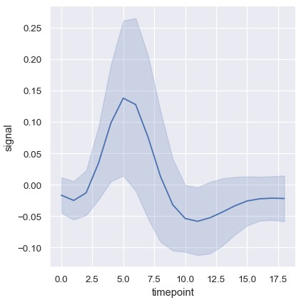 1 | sns.relplot(x='timepoint', y='signal', ci='sd', kind='line', data=fmri) |