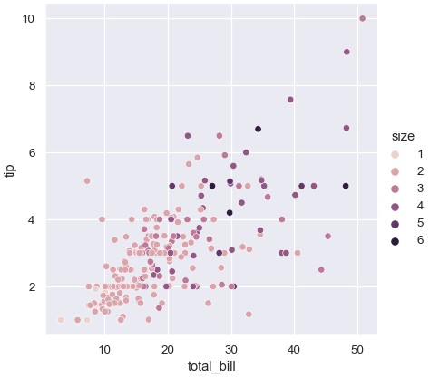 1 | sns.relplot(x='total_bill', y='tip', hue='size', data=tips) |