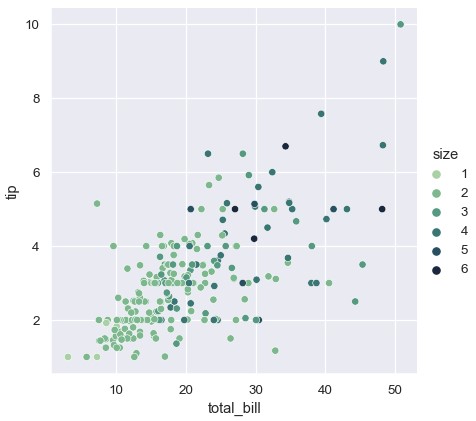 1 | sns.relplot(x='total_bill', y='tip', hue='size', palette='ch:r=-.5,l=.75', data=tips) |