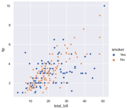 1 | sns.relplot(x='total_bill', y='tip', hue='smoker', style='smoker', data=tips) |