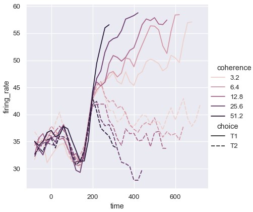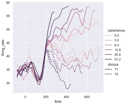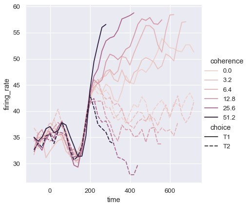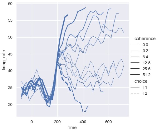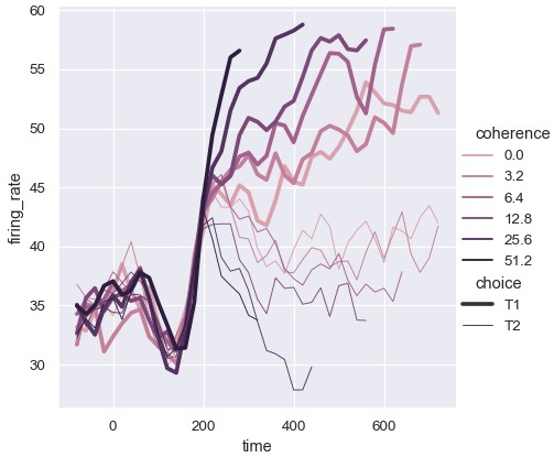 1 | sns.relplot(x='time', y='firing_rate', size='coherence', size='choice', palette=palette, kind='line', data=dots) |
