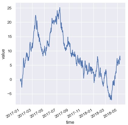 1 | df = pd.DataFrame(dict(time=pd.date_range('2017-1-1', periods=500), value=np.random.randn(500).cumsum())) |