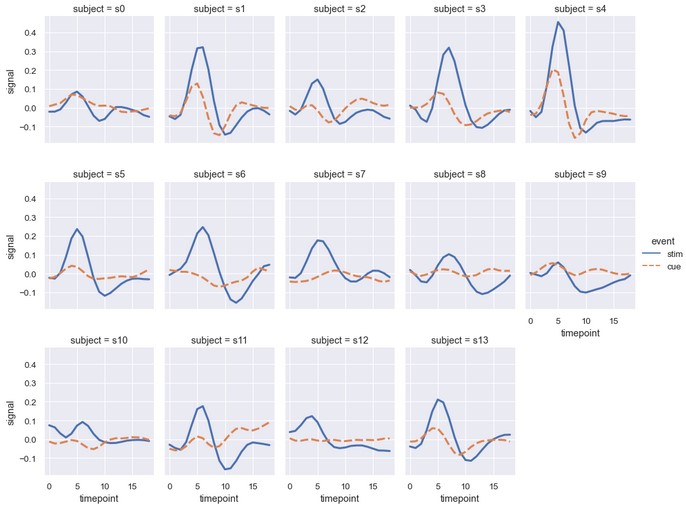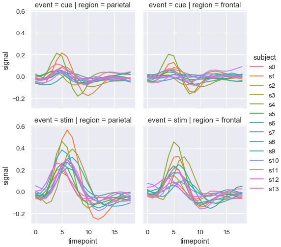 1 | sns.relplot(x='timepoint', y='signal', hue='subject', col='region', row='event', height=3, kind='line', estimator=None, data=fmri) |