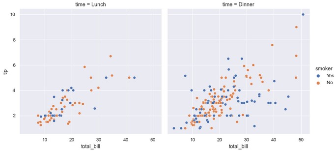 1 | sns.relplot(x='total_bill', y='tip', hue='smoker', col='time', data=tips) |