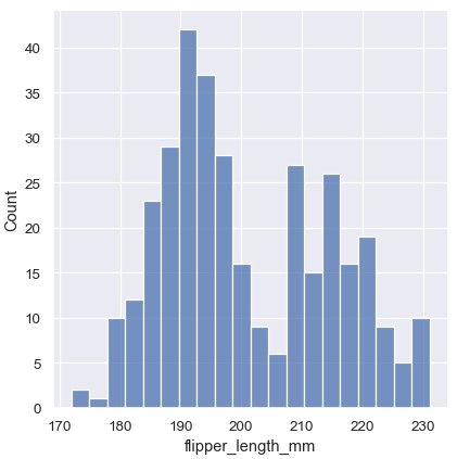 1 | sns.displot(penguins, x='flipper_length_mm', bins=20) |