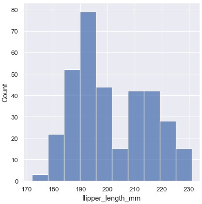 1 | sns.displot(penguins, x='flipper_length_mm', kind |