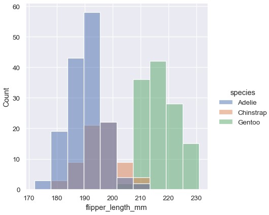 1 | sns.displot(penguins, x='flipper_length_mm', hue= |