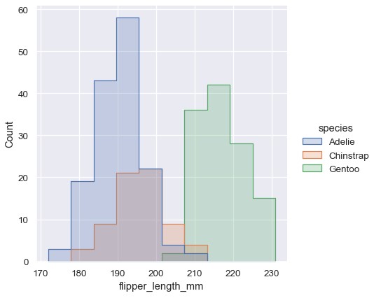 1 | sns.displot(penguins, x='flipper_length_mm', hue='species', element='step') |