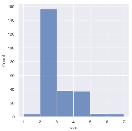 1 | sns.displot(tips, x='size', bins=[1, 2, 3, 4, 5, 6, 7]) |