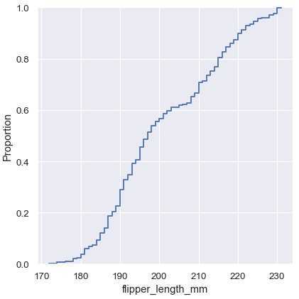 1 | sns.displot(penguins, x='flipper_length_mm', kind='ecdf') |