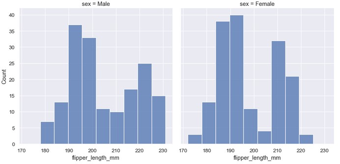 这个图片直接提供了一些关于flipper_length_mm变量的新视角。比如,最常见的鳍状肢长度大约是195mm,但是数据的分布似乎是双峰的,因此这个数值并不能很好地代表所有数据