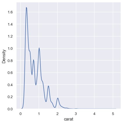 对于离散型数据或者数据本身是连续的,但是有些取值数量极大的情况下,KDE也会失效。要牢记,KDE总是会展示一条平滑的曲线,即使数据本身并不平滑。例如,钻石重量的分布: