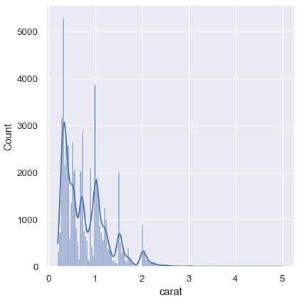 1 | sns.displot(diamonds, x='carat', kde=True) |