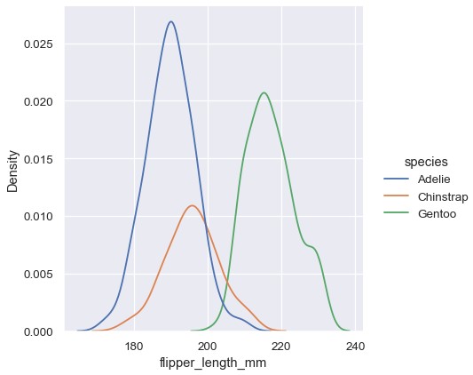 1 | sns.displot(penguins, x='flipper_length_mm', hue='species', kind='kde') |