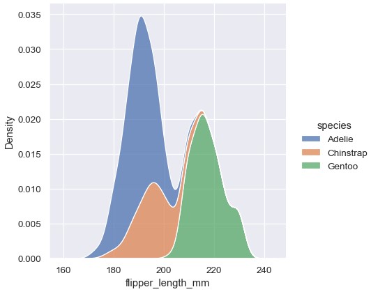 1 | sns.displot(penguins, x='flipper_length_mm', hue='species', kind='kde', multiple='stack') |