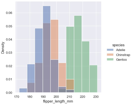 1 | sns.displot(penguins, x='flipper_length_mm', hue='species', stat='density', common_norm=False) |